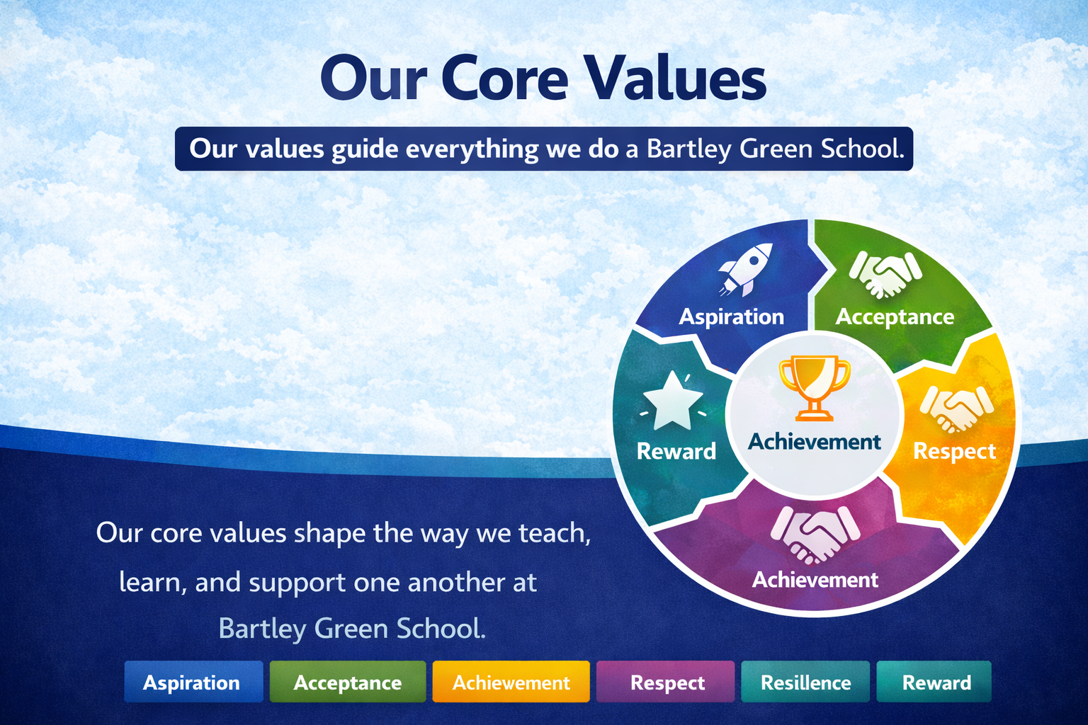 At Bartley Green School, our core values are more than words displayed on a wall, they are the foundation of everything we do. They shape our culture, guide our decisions and define the expectations we hold for ourselves and one another.